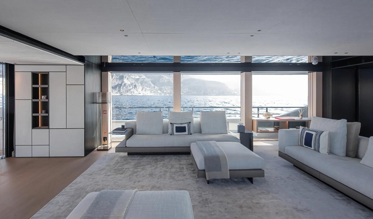 Inside, the main saloon with lounge and dining spaces has massive floor to ceiling windows for light and views. Accommodation is extremely spacious, with huge panoramic windows, owner's suite plus four VIP cabins.