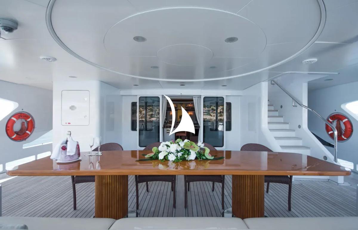 Dominated by light, the main salon and upper sky lounge offer an inviting ambiance. The latter includes a bar and extensive seating, leading out to the bridge deck where a large dining table, gym equipment and sun pads can be found. The more formal main saloon and its adjoining dining area benefit from deep, luxurious sofas, a bar and a large dining table for up to 10 guests.